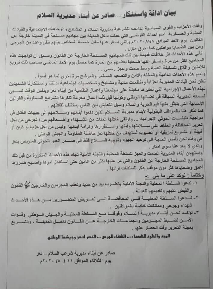 شرعب السلام فى تعز تصدر بيان إدانة وإستنكار حول أحداث غزوان وغدر