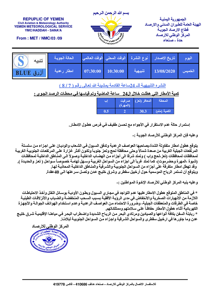 النشره التنبيهية للـ 24ساعة القادمة من الهيئة العامة للأرصاد في اليمن