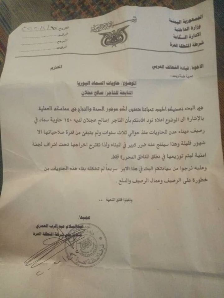 بن لزرق يؤكد بالوثائق وجود شحنة كبيرة من نترات الالمنيوم في ميناء عدن