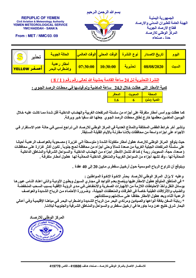 الهيئة العامة للأرصاد في اليمن تطلق نشرة تحذيرية مما سيحدث في الساعات...