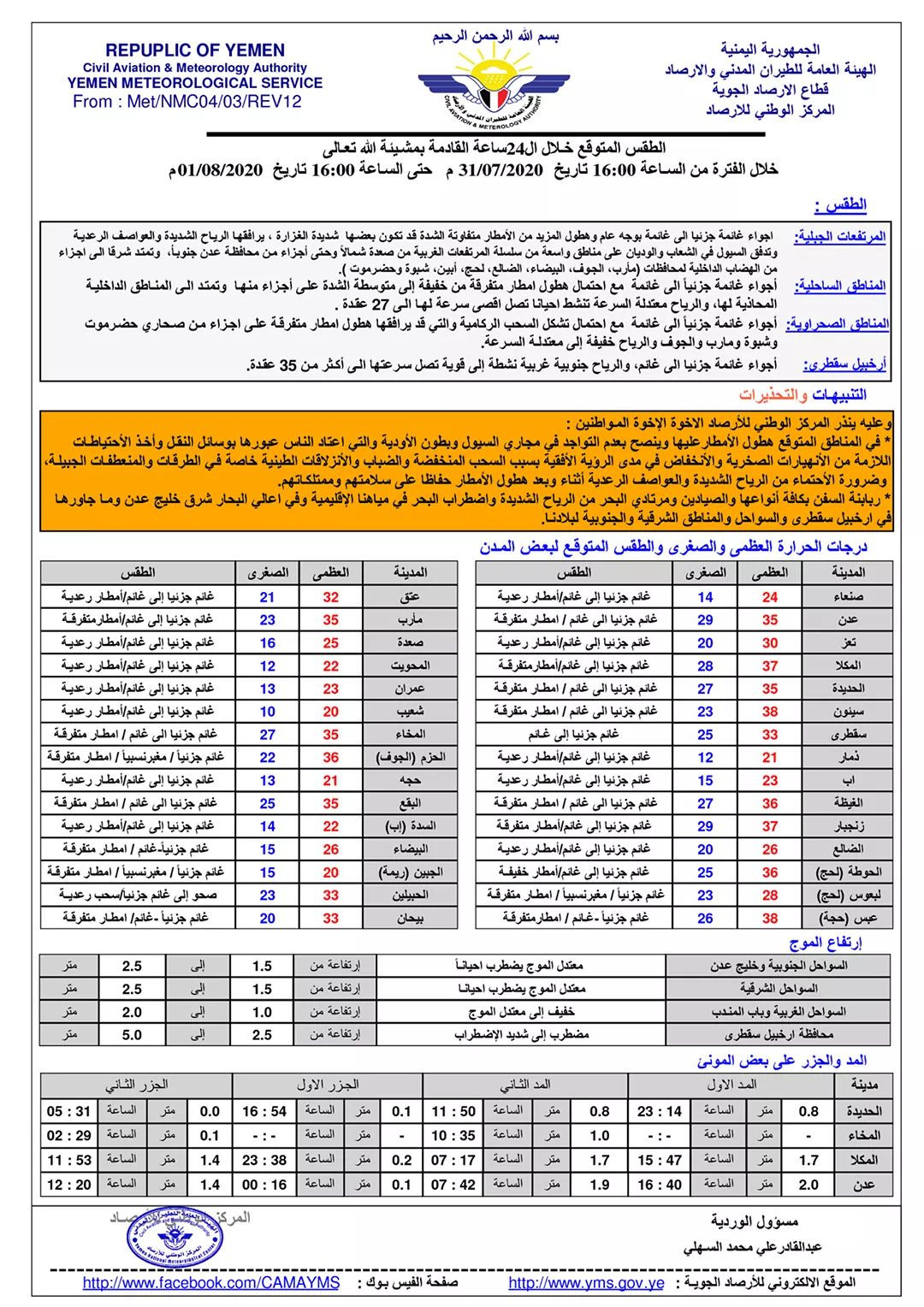 توقعات الطقس في اليمن من الهيئة العامة للأرصاد ليوم غداً