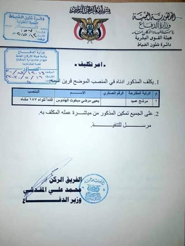 وزارة الدفاع اليمنية تعين شيخ قبلي لا ينتمى للموسسة العسكرية قائداً للواء...