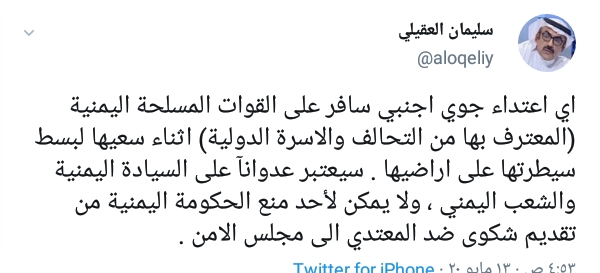 "العقيلي" يحذر من اي اعتداء جوي على قوات الجيش الوطني