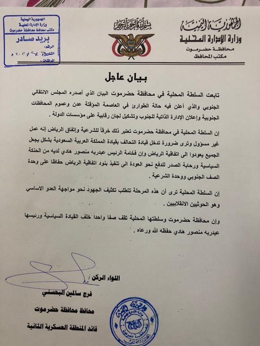 عاجل : محافظة حضرموت تعلن موقفها من البيان الذي صدر من الإنتقالي أمس