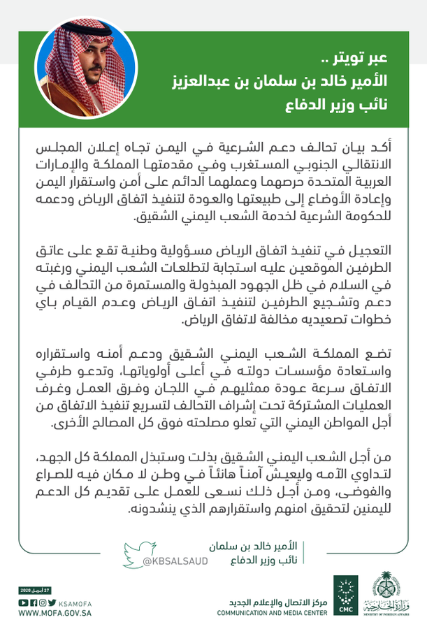 عاجل : وزارة الدفاع السعودية تعلن الوقوف مع الشرعية في تنفيذ إتفاقية الرياض