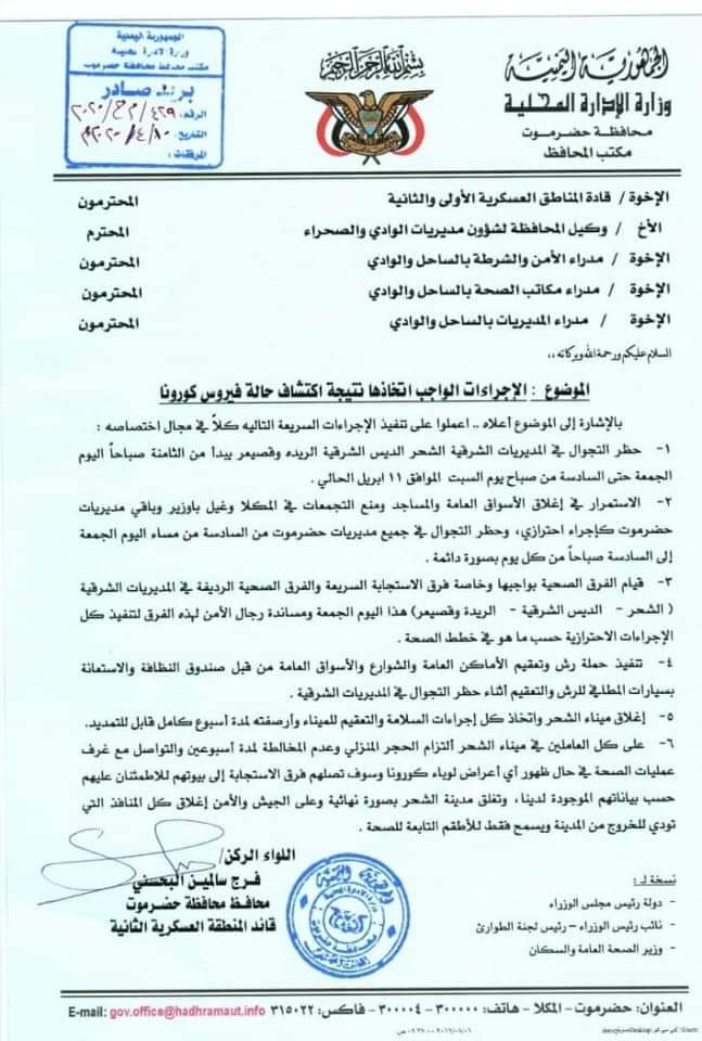 حقيقة تسجيل أول حالة لمصاب بفيروس كورونا في حضرموت (وثيقة)