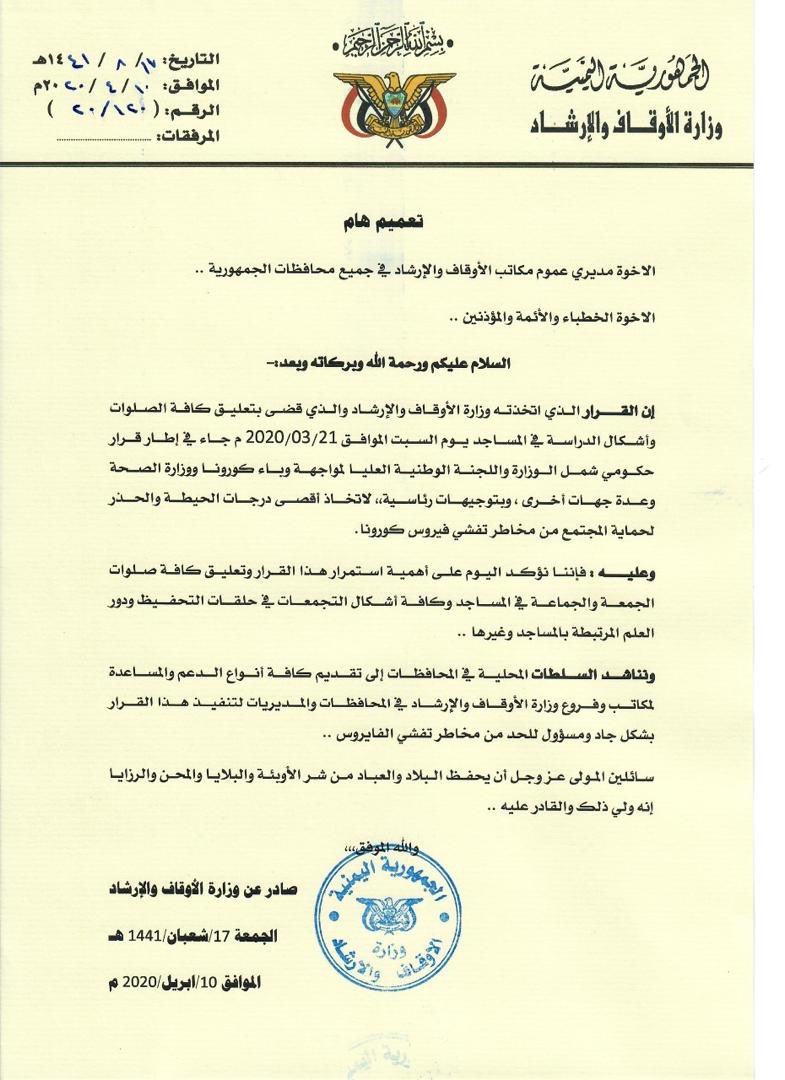 وزارة أوقاف حكومة الشرعية ..... تصدر تعميم هام جدآ لعدم تنفيذ الأوامر واغلاق...