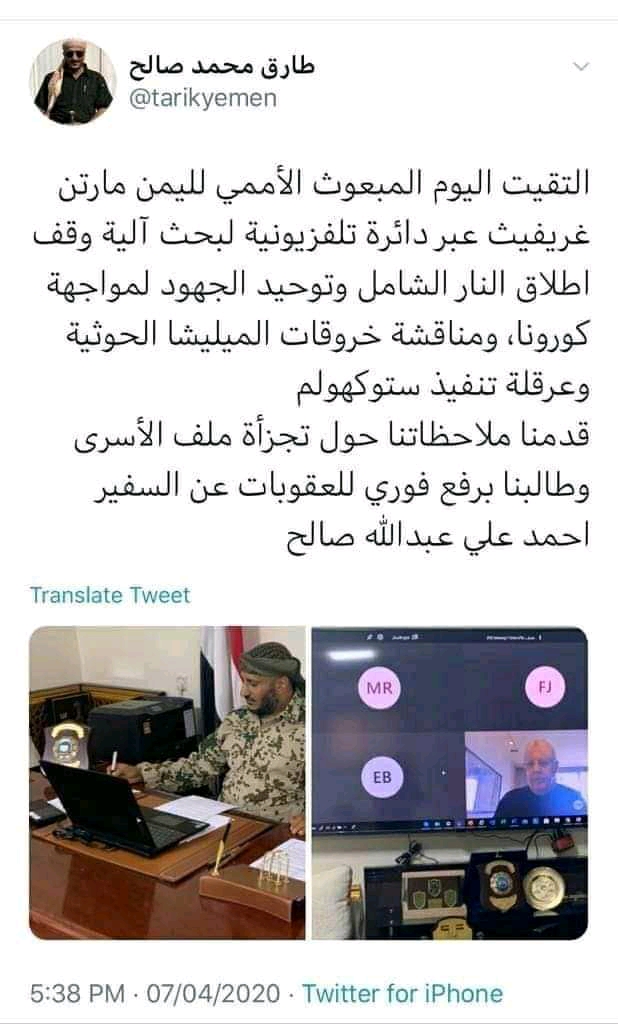 العميد طارق صالح يلتقي بغريفيث مبعوث الأمم المتحدة في اليمن لأسباب مهمة