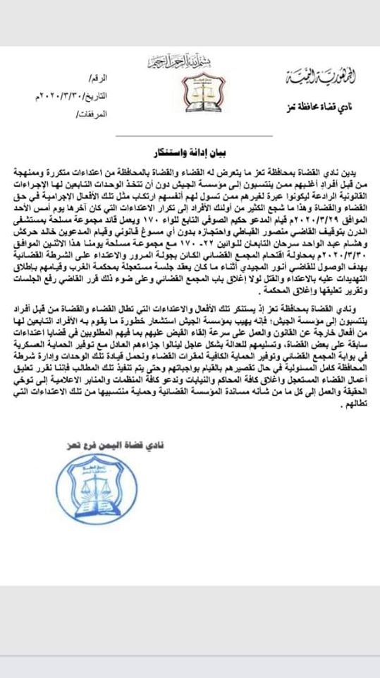 نادي القضاة يعلق أعمال المحاكم والنيابات في تعز إحتجاجآ (وثيقة)