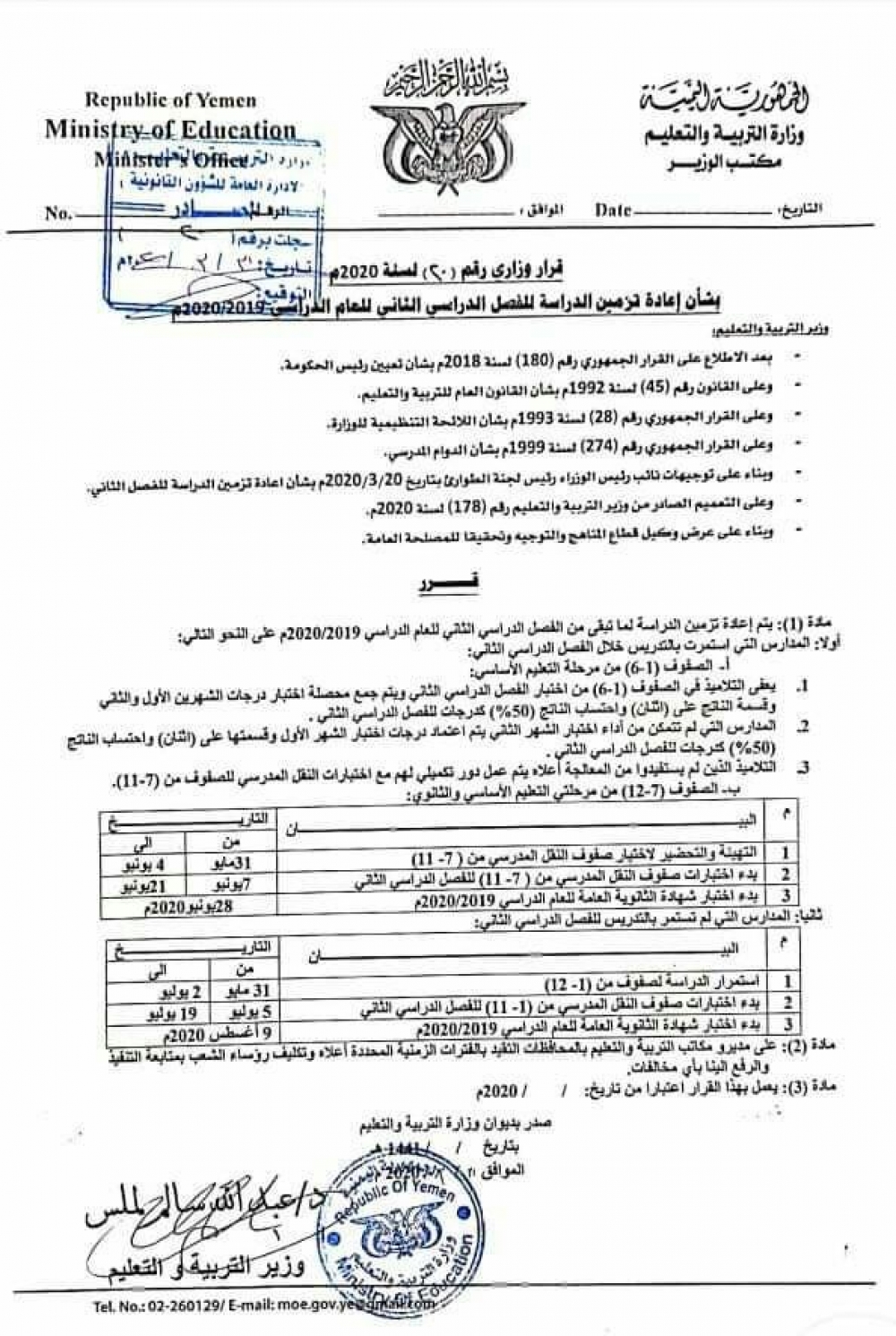 تربية وتعليم الشرعية تعلن موعد الإمتحانات النهائية للعام الدراسي 2019 -2020 ...