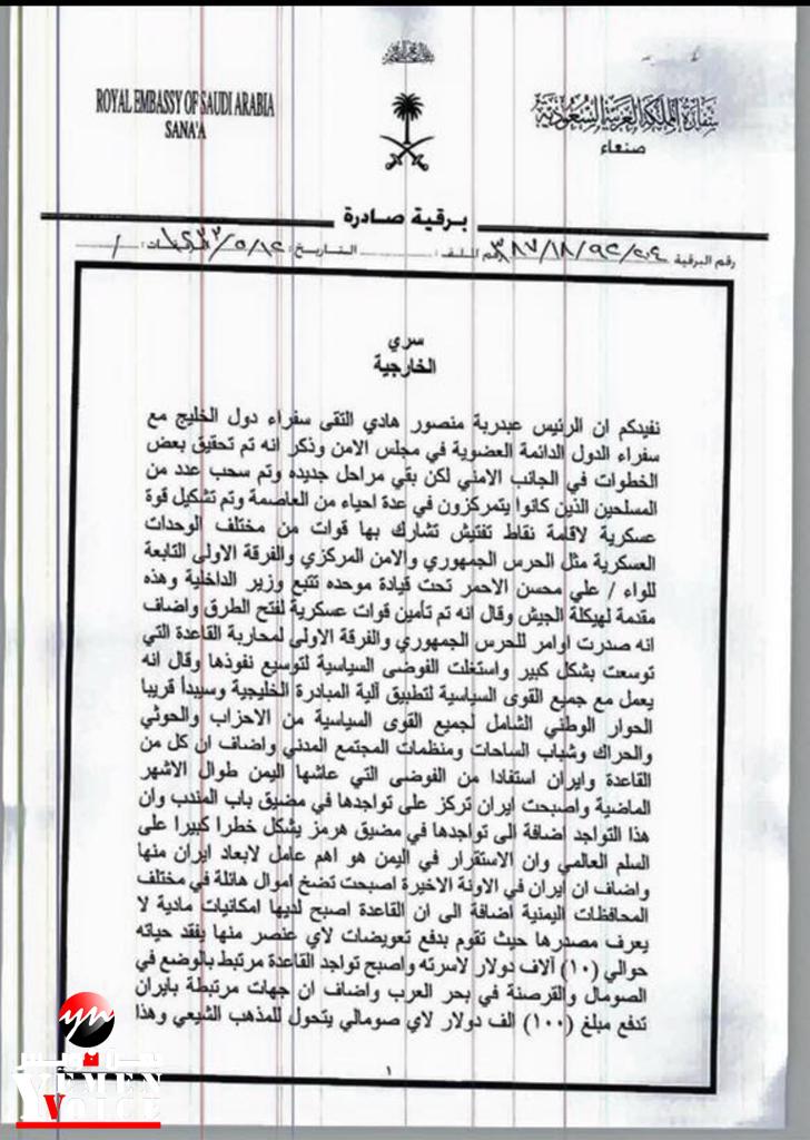 نشر وثيقة "سري للغاية" صادرة عن السفارة السعودية حول الرئيس هادي في العام 2012م