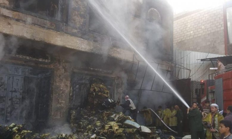 حريق هائل يلتهم عدد من المحلات التجارية بالعاصمة صنعاء